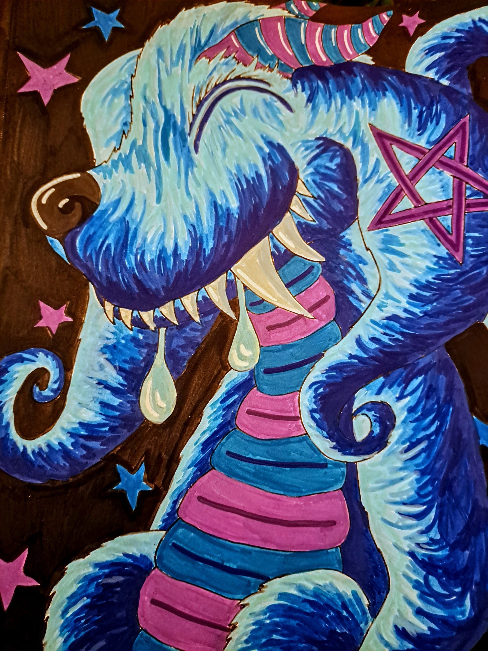 This Dragon Doggo is done with Acrylic Markers on 9in by 12in 98LB Mixed media paper.