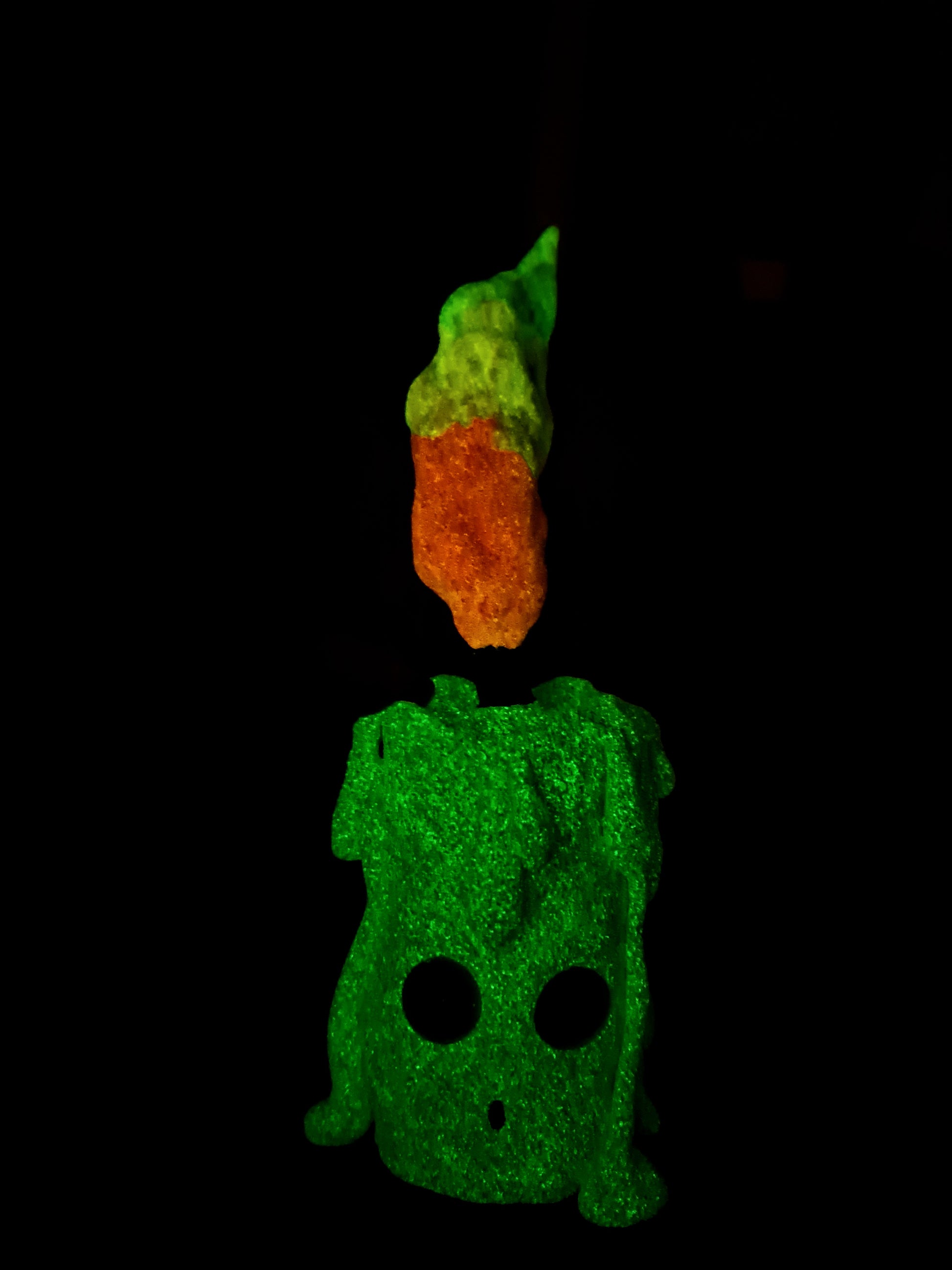 This little Flame Familiar is handmade with polymer clay with a clear top coat for protection. This piece also glows in the dark in multiple different colors!